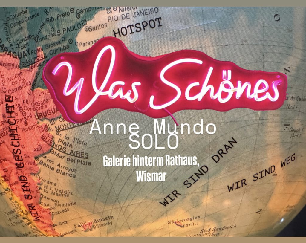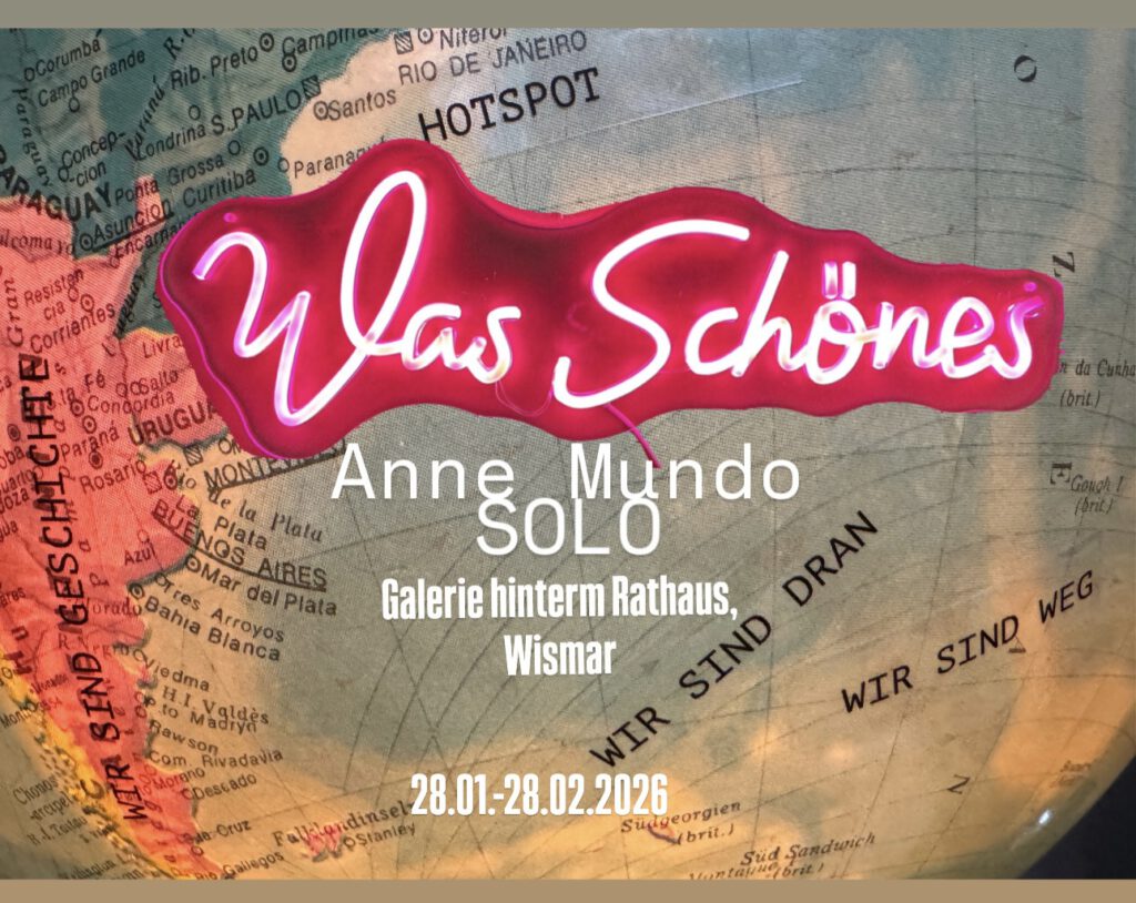 In der Galerie Wismar zeigt Anne Mundo unter dem Titel „Was Schönes“, neben der Installation im Schaufenster zur Innen-Ein und Außen-Ansicht, Zeichnungen und Malereien, die u.a. auf klanglich- verspielte, und assoziative Herangehensweisen setzen. Titel wie: „Der Flieder kommt wieder“,2021, „Mindful music, (apricot-melon)“, deutsche und japanische Tusche auf Reispapier, 2022, „Freizeit (2,3)“, und die Reihe: „Die Entwurzelten, lo Sradicato, the uprooted – in Gedenken an Ursula Hirschmann“, von 2025 zeugen von Mundo´s nicht nur farblich pastosen, kontraststarken Anliegen in der Kunst. Ihr Interesse gilt bestimmten Themen und deren künstlerischen Interpretationsmöglichkeiten, die sie wiederum durch ihre Erforschungslust und die dabei entstehende Vielschichtigkeit aufdeckt und oftmals als einen Zwiespalt oder Widerspruch enträtselt. Erst die Liebe auf den zweiten Blick, so könnte man sagen, entlarvt die Oberfläche als ideales, reines Schönheitsmuster. Beim genaueren Sehen und Denken werden die optischen „Fehler“ kontextualisiert und in ein auch inhaltliches Gesamtbild von Schönheit mit einbezogen. Walter Benjamin (1892 – 1940) hat den Charakter des Schönen auf die einfache Formel gebracht: „Das Schöne ist weder die Hülle noch der verhüllte Gegenstand, sondern das Schöne ist der Gegenstand in seiner Hülle.“