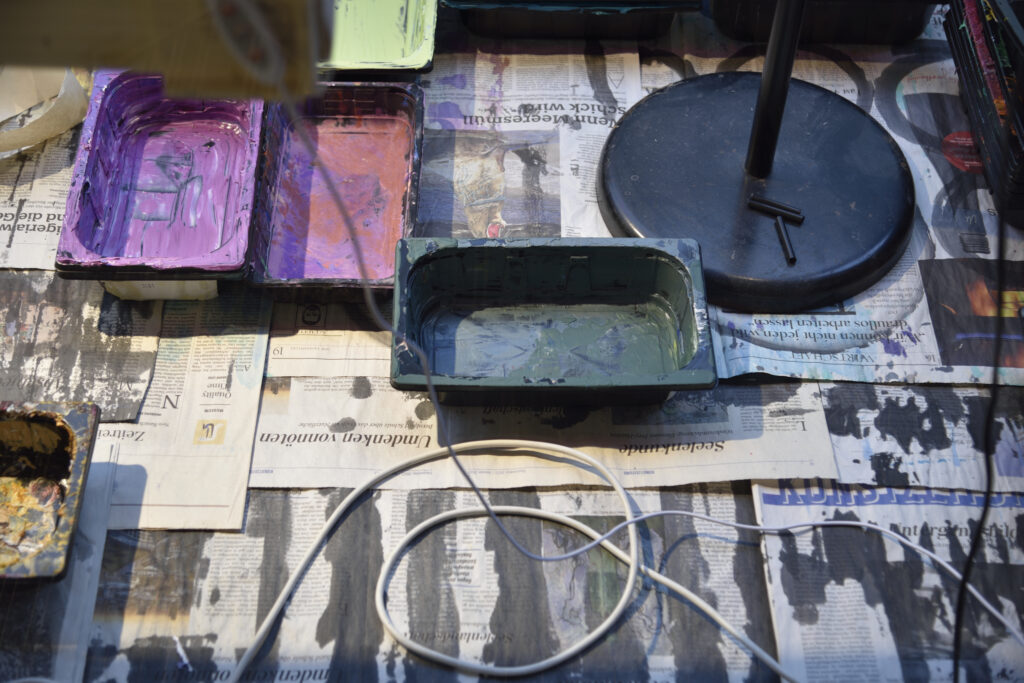 Am Tag der Ausstellungseröffnung jährt sich der Beginn des Angriffskrieges russischer Streitkräfte auf die Ukraine. Das letzte Jahr hinterlässt seine Spuren, auch in den Ateliers. Bezüge gibt es in einigen Arbeiten, wie die für die Ausstellung BERLIN CALLING vor Ort entstandene